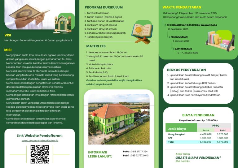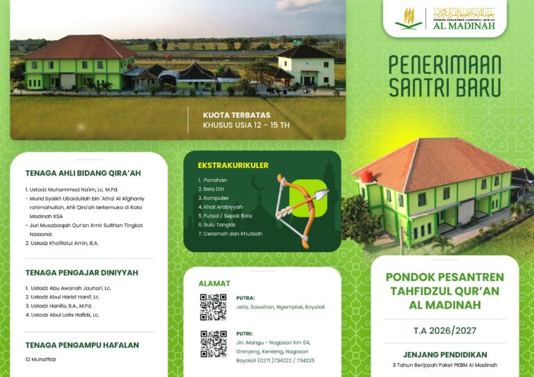 Kami mengundang Anda untuk menjadi bagian dari PPTQ Al Madinah, tempat di mana para santri belajar menghafal Al-Qur’an dengan penuh semangat dan membangun karakter yang kuat. Di sini, kamu akan mendapatkan pendidikan berkualitas dalam lingkungan yang mendukung dan penuh berkah, in syaa Allah.